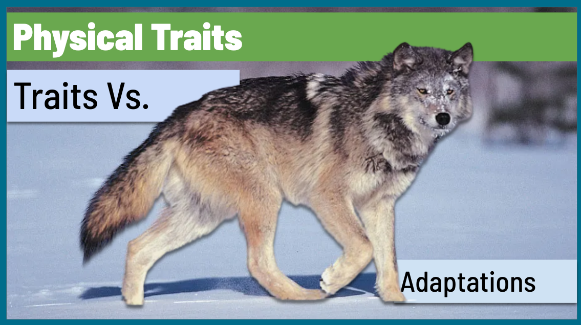 Define what a physical trait is and what an adaptation is (how are they similar and different). Use the wolf as an example.