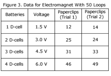 He held the bolt near a pile of paperclips and counted how many paperclips the electromagnet could hold. Then, he removed all the paperclips and conducted a second trial with the same setup. Next, he added a second battery to the electromagnet. Again, he conducted two trials testing how many paperclips the electromagnet held. He repeated his procedure, adding a third battery and then a fourth battery. He calculated the circuit's voltage each time he added a battery. His results are shown in Figure 2.