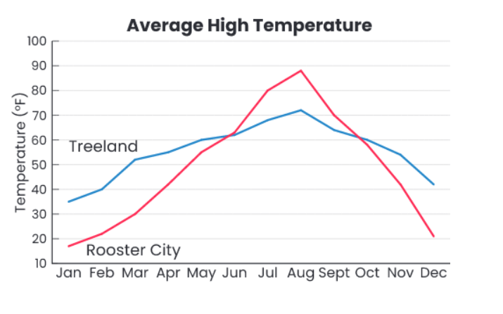 This line graph shows the average high temperature in each month for two cities, Rooster City and Treeland. How do typical temperatures compare between the two cities?