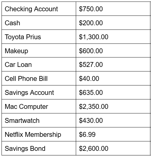 Kylie plans to go to Europe next summer with her family. She probably will be able to save enough money by working all year at her part-time job. However, she is prepared to sell some of her possessions if necessary, so she has made a list of her possessions. Help Kylie determine which of the following are assets or liabilities and help her compute her net worth.