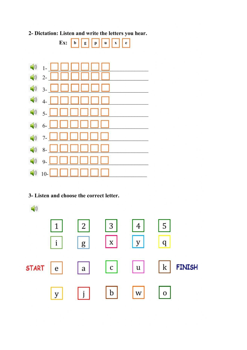 Dictation: Listen and write the letters you hear. Ex: b g p u x e.