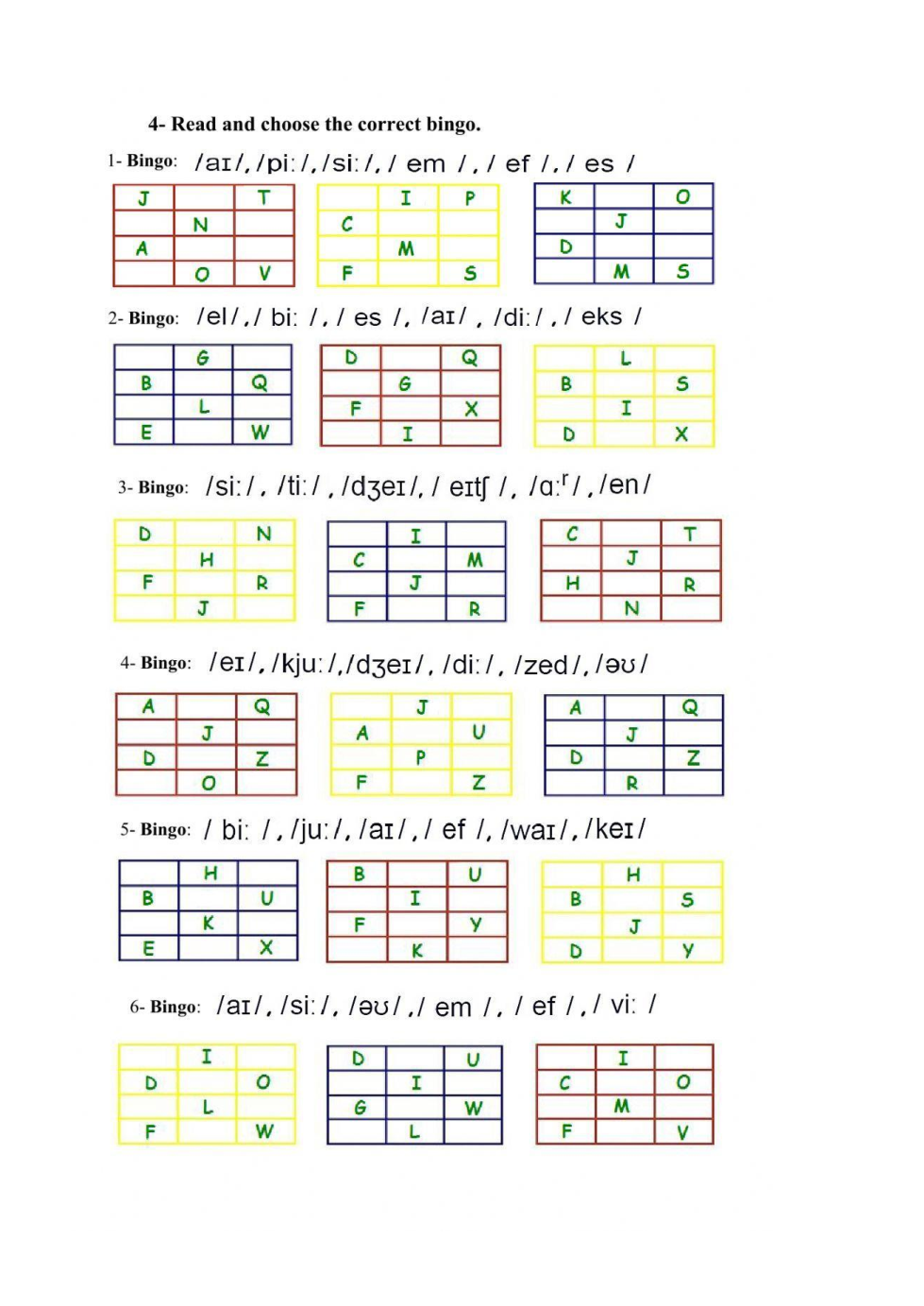 Bingo: /siː/, /tiː/, /dʒeɪ/, /eɪtʃ/, /ɑːr/, /en/