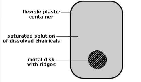 A design for a hand warmer is shown below. When the metal disk is bent, the dissolved chemicals begin crystallizing around the disk and spread throughout the container. As the chemicals crystallize, they release heat. However, the container gets so hot that it is uncomfortable against skin. DOK 2