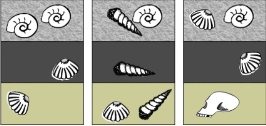 The picture shows fossils preserved in rock layers at three locations. DOK 2