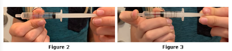 He removed the cap from the syringe and pressed the syringe's plunger all the way in to the 0-mL line. Then he filled the syringe with air by pulling the plunger out to the 3-mL line (shown in Figure 2). He immediately pressed a finger against the tip of the syringe to prevent air from escaping. Then, with his finger still pressed firmly over the tip, he pressed the plunger in as far as it would go (shown in Figure 3). The plunger stopped at the 1.5-mL line.