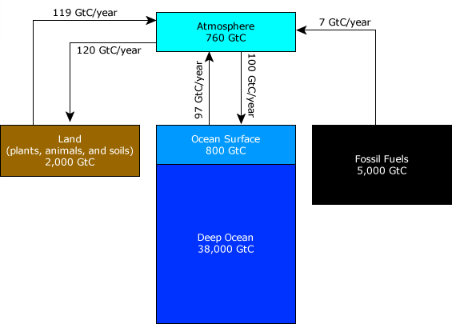 The student made a model to show carbon fluxes on Earth, shown below. The boxes represent different reservoirs. The numbers in each box show the approximate amount of carbon in that reservoir. The carbon is measured in gigatons of carbon (GtC). For example, Earth's atmosphere contains approximately 760 gigatons of carbon. The arrows represent carbon fluxes, measured in gigatons of carbon per year. For example, burning fossil fuels moves approximately 7 gigatons of carbon into the atmosphere each year. Because carbon is constantly fluxing between reservoirs, the numbers in the model are the best estimates based on current data.