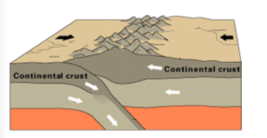 The collision of continental tectonic plates results in the __________ shown in the model. The energy that drives the process comes from __________.