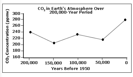 The concentration of carbon dioxide in Earth's atmosphere rises above 300 ppm around __________. This increase __________ historical patterns and is mostly caused by __________.