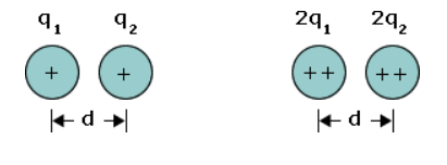 The force between charges q1 and q2 is __________. When the magnitude doubles for both charges q1 and q2, the force between the two charges becomes __________.