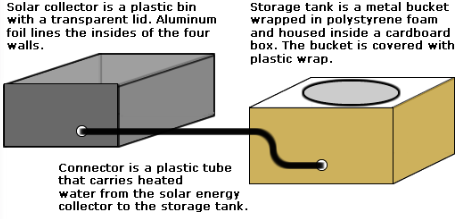 A student is tasked with designing a simple solar water heater. The solar water heater should be designed to meet two goals: 1) increase the temperature of water as much as possible and 2) prevent the water from losing that heat once it enters storage. The design needs to be composed of three main parts: a solar collector, which collects solar energy and heats water; a storage tank, where the water is stored after it is heated; and a connector, which transports the heated water from the solar collector to the storage tank. The only restriction on the design materials is that the student may not use electronics.