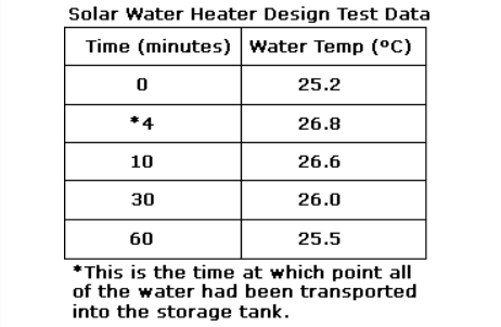 The student set her design up for testing by placing the solar collector outside in direct sunlight and placing the storage tank under shade. After allowing the solar collector to collect heat for an hour, she poured the water into it. She measured the water's change in temperature over the course of an hour. The table shows the results of the test.