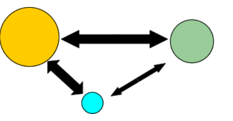 The diagram models how gravity works in our solar system. The sizes of the spheres are directly proportional to their masses. The sizes of the arrows are directly proportional to force.