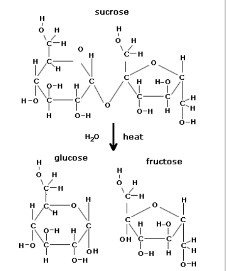 Together, one glucose molecule and one fructose molecule have __________ one sucrose molecule; therefore, sucrose must __________ as it decomposes.