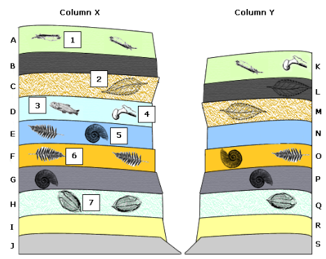 The diagram shows the geological columns in two locations, along with fossils discovered in those layers.