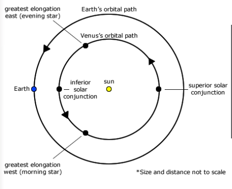 When it's visible, Venus is one of the brightest objects in Earth's sky. The planet, which takes about 224 Earth days to orbit the sun, is visible in Earth's night sky for almost ten Earth months as Venus travels from the point of superior solar conjunction toward the point of inferior solar conjunction. It's brightest in the evening as it nears its point of greatest elongation east. Then, as Venus passes the point of inferior solar conjunction, it disappears for a few weeks. It reappears in Earth's morning sky. It's brightest in the morning as it nears its point of greatest elongation west. After approximately eight months in Earth's morning sky, Venus passes out of view again as it reaches the point of superior solar conjunction. Again, Venus remains invisible for a few weeks. When it reappears, it's in the evening sky. The entire cycle takes about 1.6 Earth years. The model below shows these points along Venus's orbit relative to Earth.