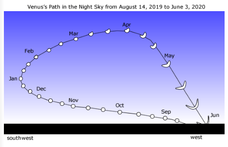 The diagram below shows Venus's path through Earth's night sky from August 2019 to June 2020. The diagram also shows Venus's phases (the change in how much of the sunlit portion of Venus is visible from Earth). These phases are not visible to the naked eye, but can be viewed through a telescope.