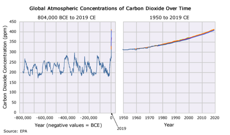 The data show concentrations of carbon dioxide in the atmosphere from hundreds of thousands of years ago through 2019, measured in parts per million (ppm). The data come from a variety of historical ice core studies and recent air monitoring sites around the world. Each line represents a different data source.