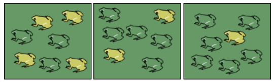 A population of frogs have moved into a new habitat. As a result of natural genetic variation, about 57 percent of the frogs are light green, and the other 43 percent are dark green. The graphic shows how the ratio of light green to dark green frogs then changes over the next several generations.