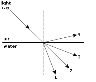 Which best models the path that the light ray will take as it travels from air into water? DOK 2