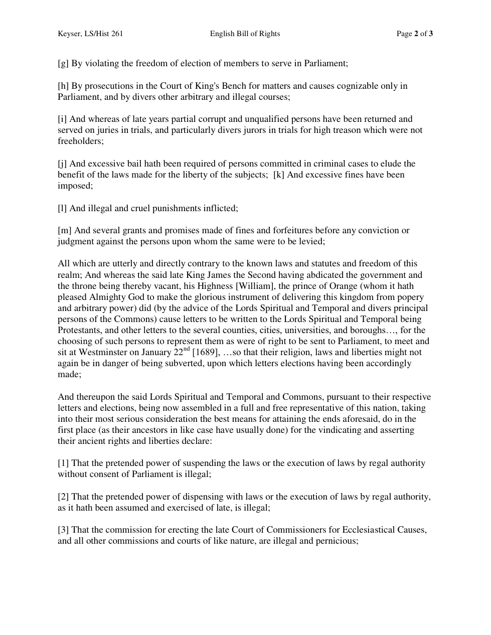The English Bill of Rights affirms the right to free elections for Parliament members. Is this statement true?