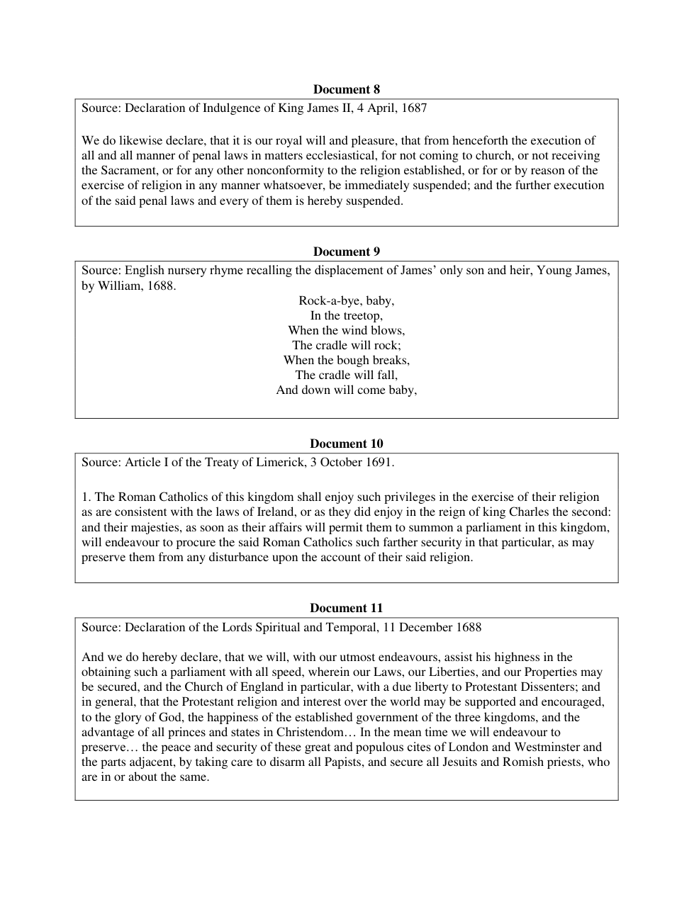 What does the nursery rhyme in Document 9 symbolize about James II's son?