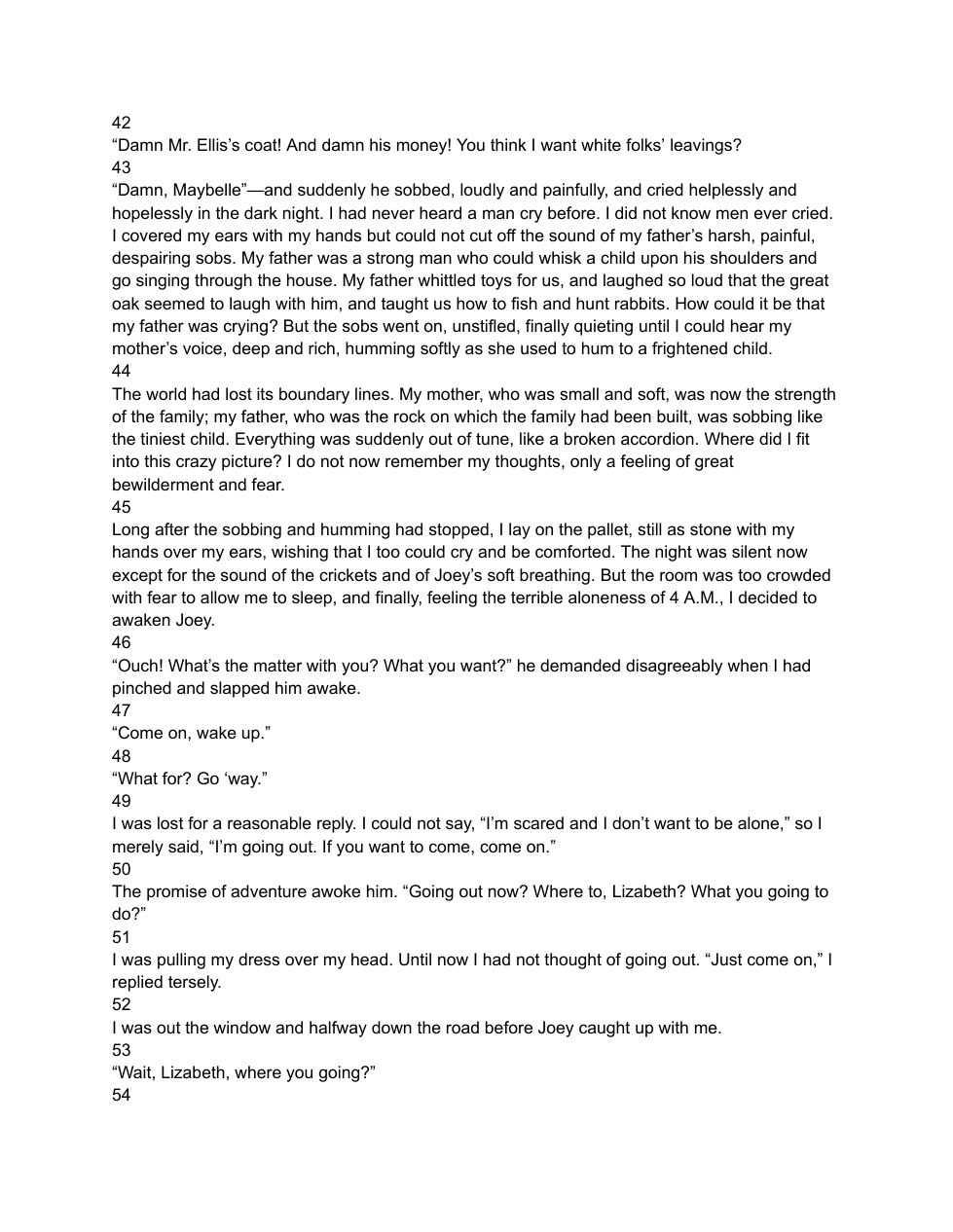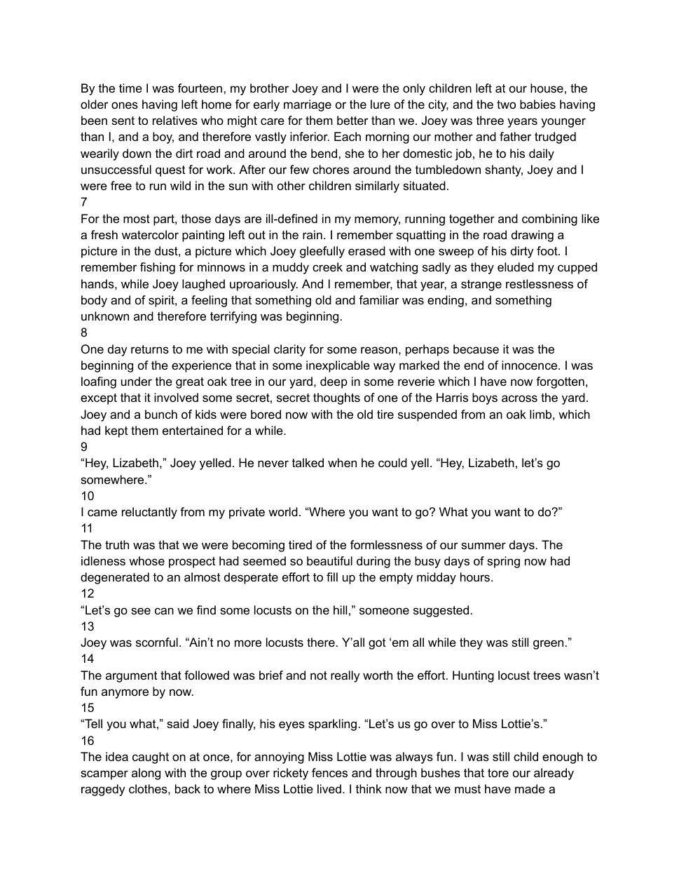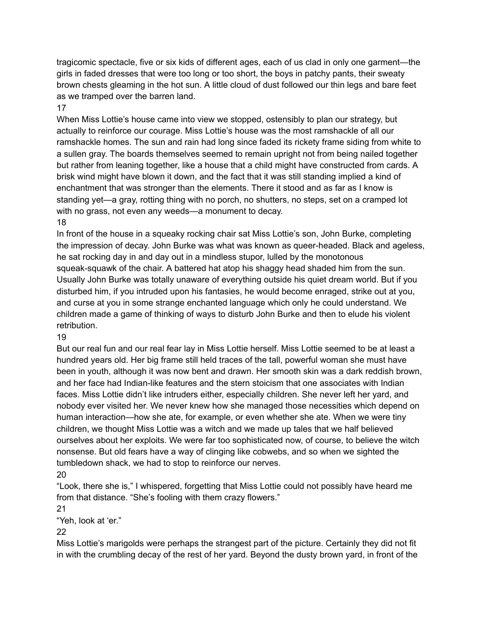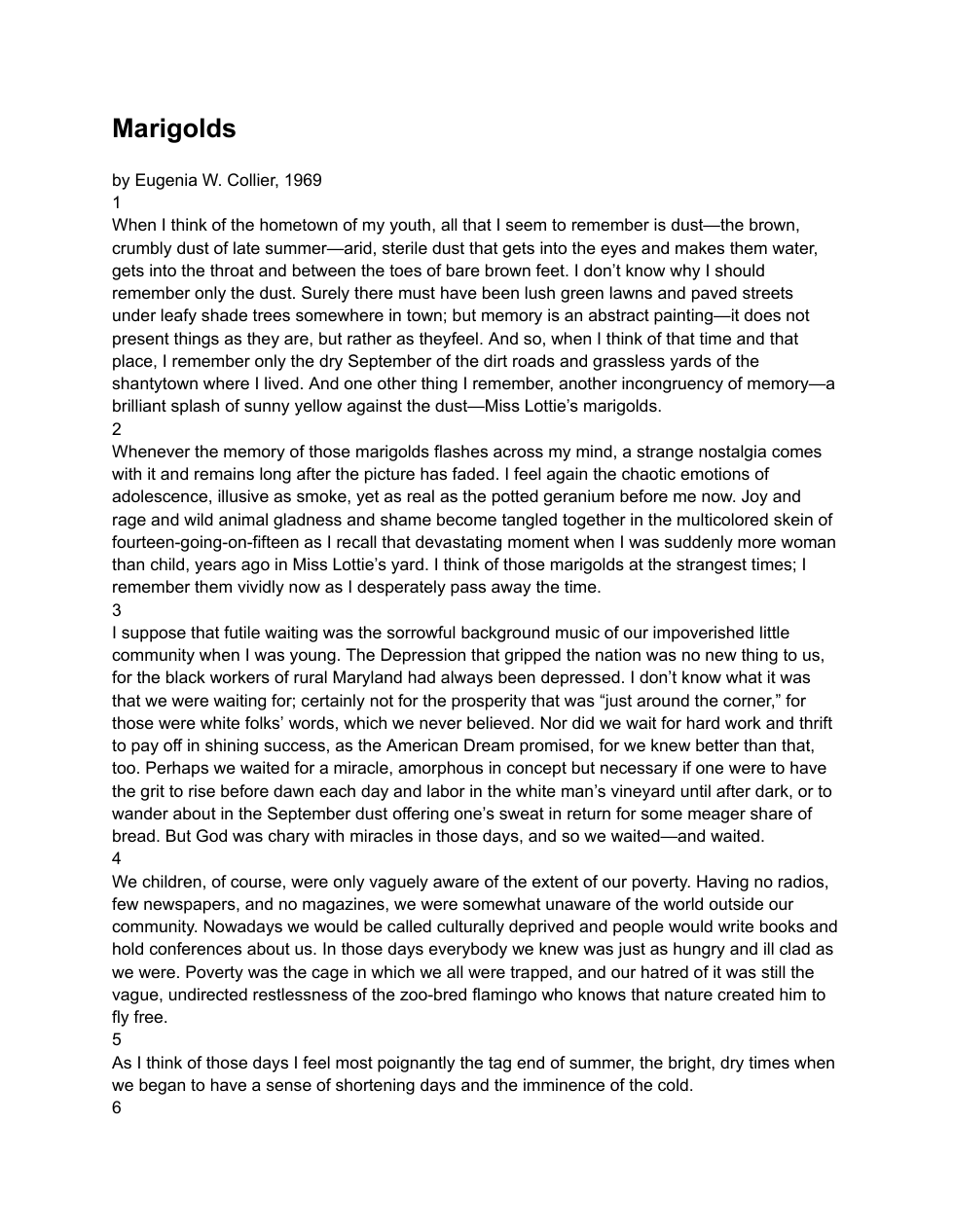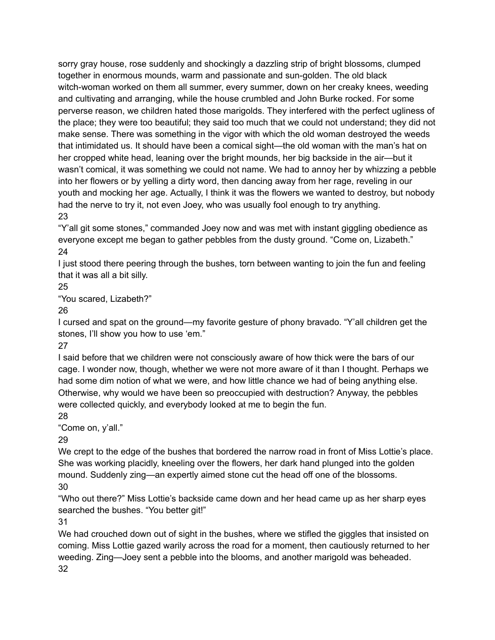 Task: After reading “Marigolds,” write a literary analysis in which you analyze the causes and consequences of Lizabeth's choices in relation to her identity. In your discussion, analyze pivotal moments that reveal important information or provoke action. Support your analysis with evidence from the text.
