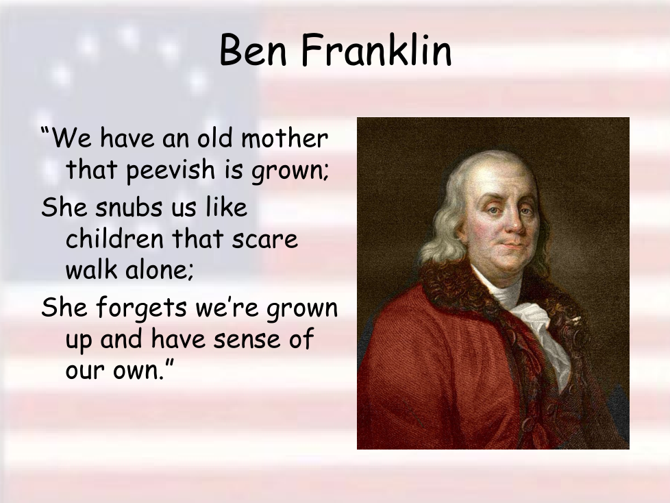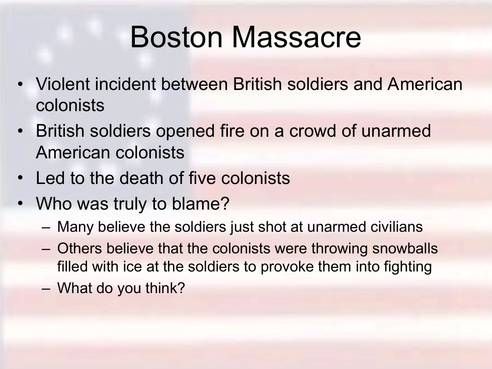 After the conclusion of the French and Indian War, the British sought to increase taxes on their American colonies and passed the Stamp Act (1765) and Townshend Acts (1767). American colonists viewed the acts as British oppression that violated their traditional rights as English subjects as well as their inalienable natural rights. The colonists mostly complained of “taxation without representation,” meaning that Parliament taxed them without their consent. During this period, most colonists simply wanted to restore their rights and liberties within the British Empire. They wanted reconciliation, not independence. But they were also developing an American identity as a distinctive people, which added to the anger over their lack of representation in Parliament and self-government.