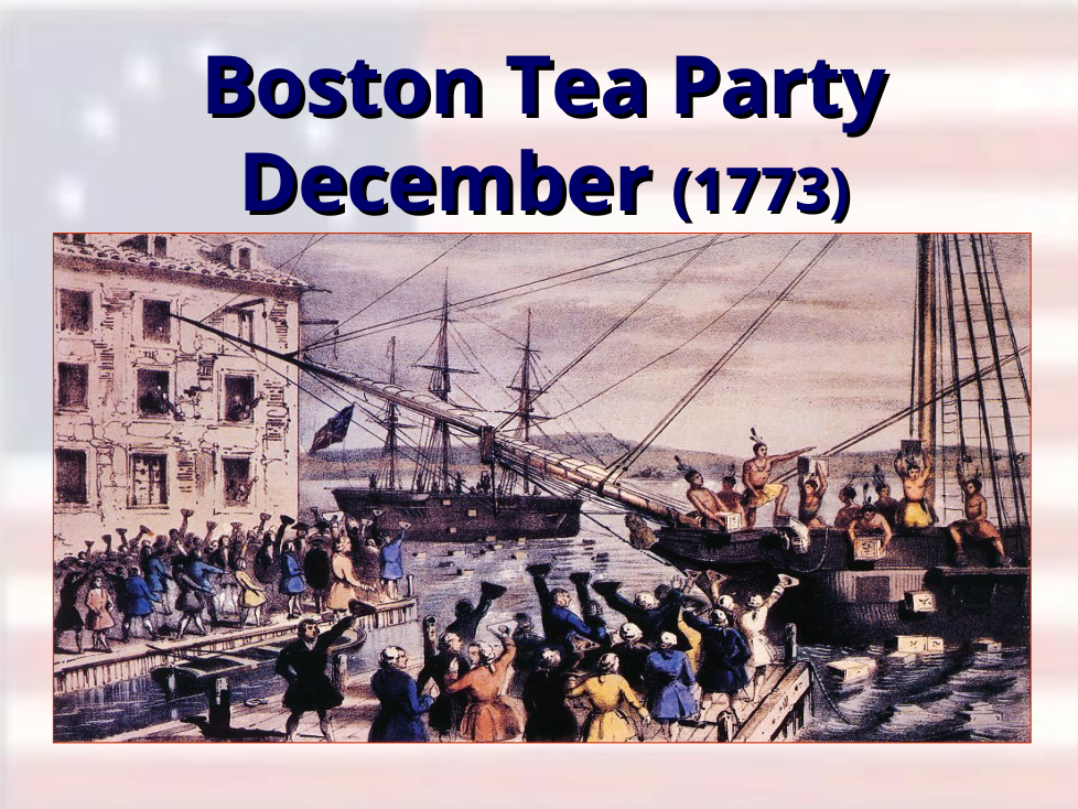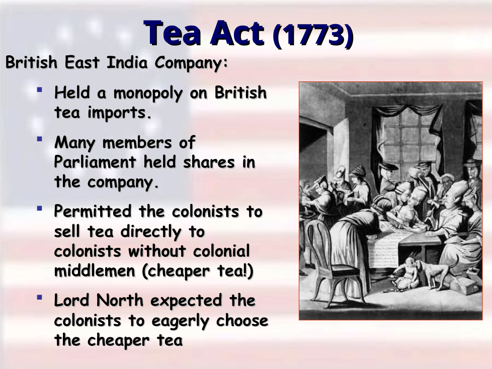 Tea Act (1773) | arrow_right_alt | Tax on printed paper |