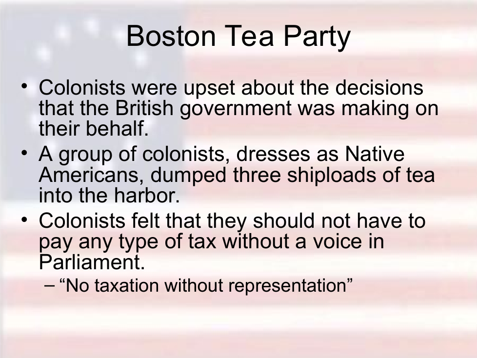 Describe the significance of the phrase "No taxation without representation" in the context of the Boston Tea Party.