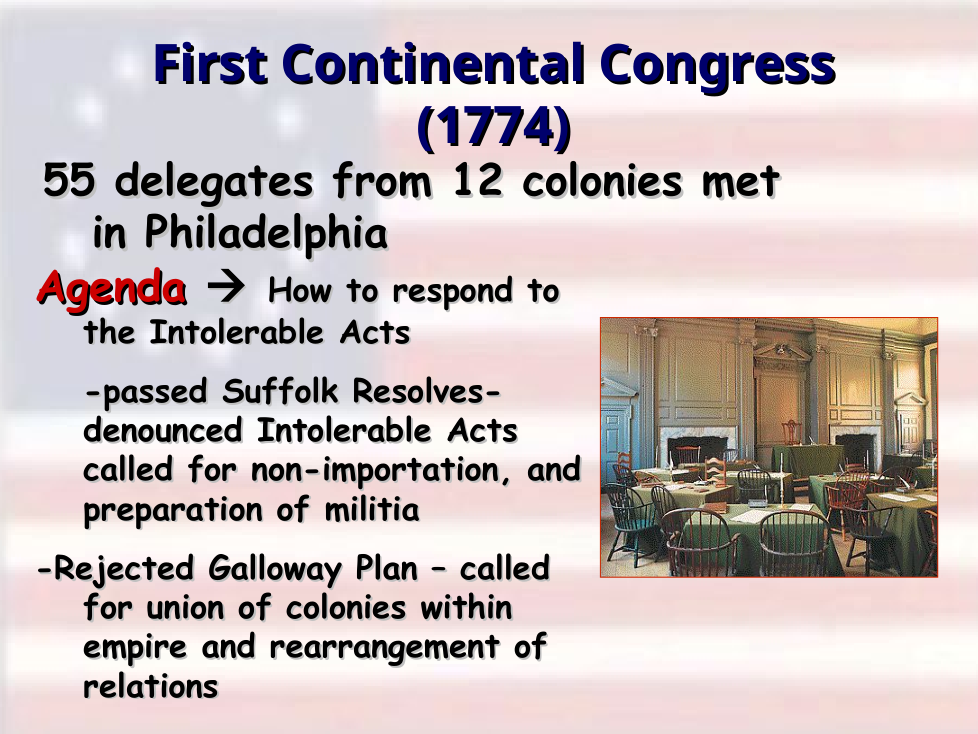 The Suffolk Resolves were passed to address the Intolerable Acts.
