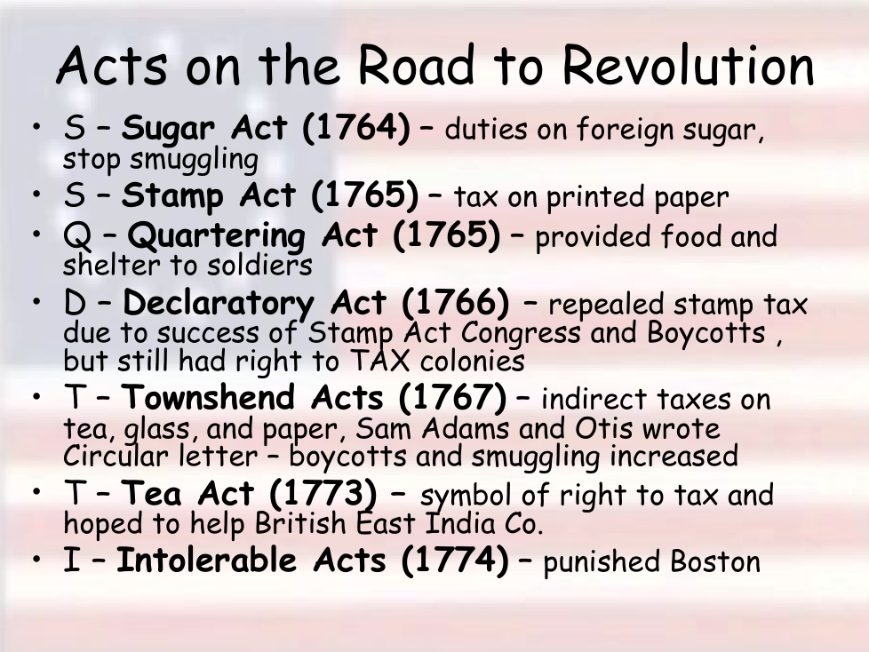 Sugar Act (1764) | arrow_right_alt | Duties on foreign sugar, stop smuggling |