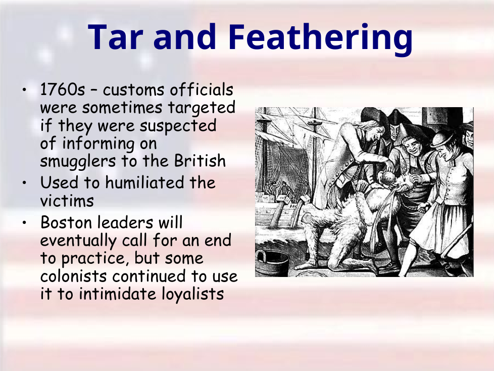 Stamp Act (1765) | arrow_right_alt | Indirect taxes on tea and glass |