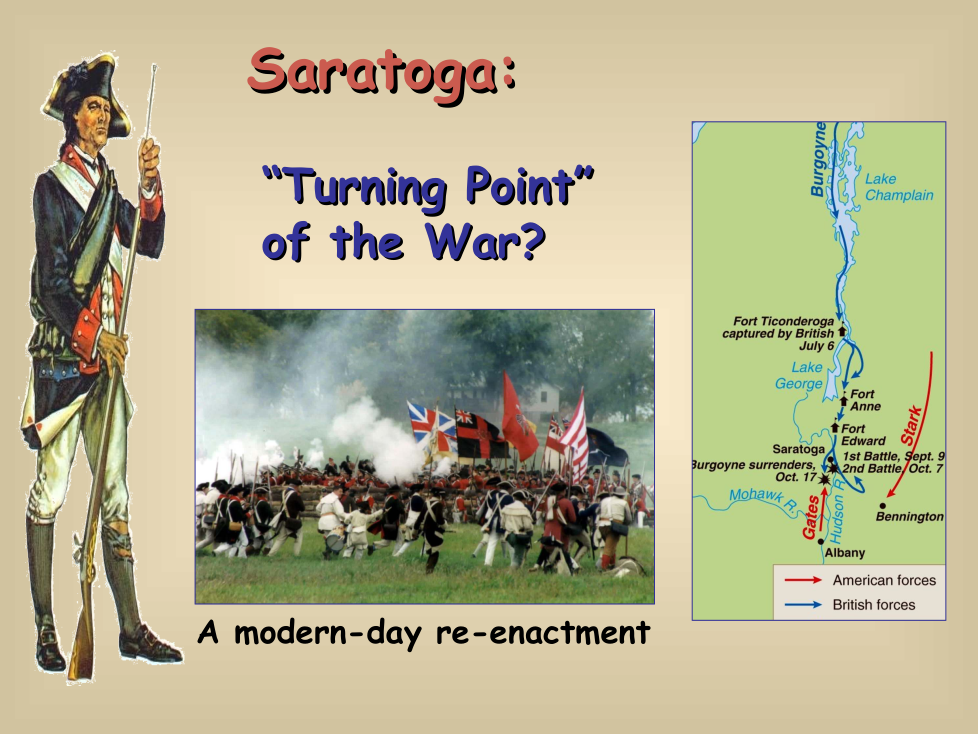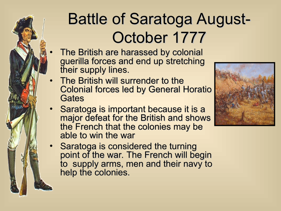 Explain the significance of the British surrender at Saratoga in terms of international support for the colonies.