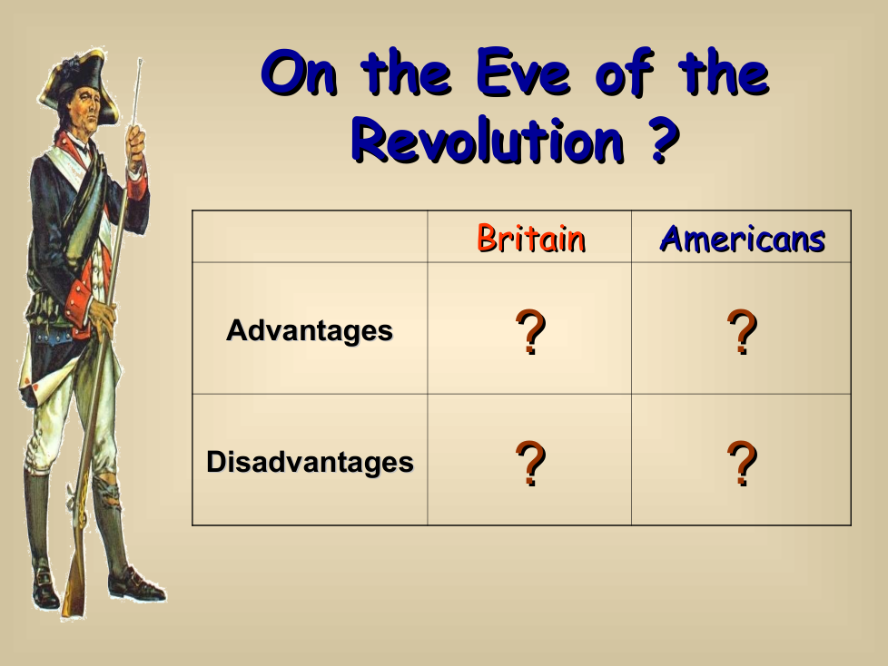 With Britain being a World power going against the colonist of young America, list 2 advantages and disadvantages for both American and Britain in regards to this War.