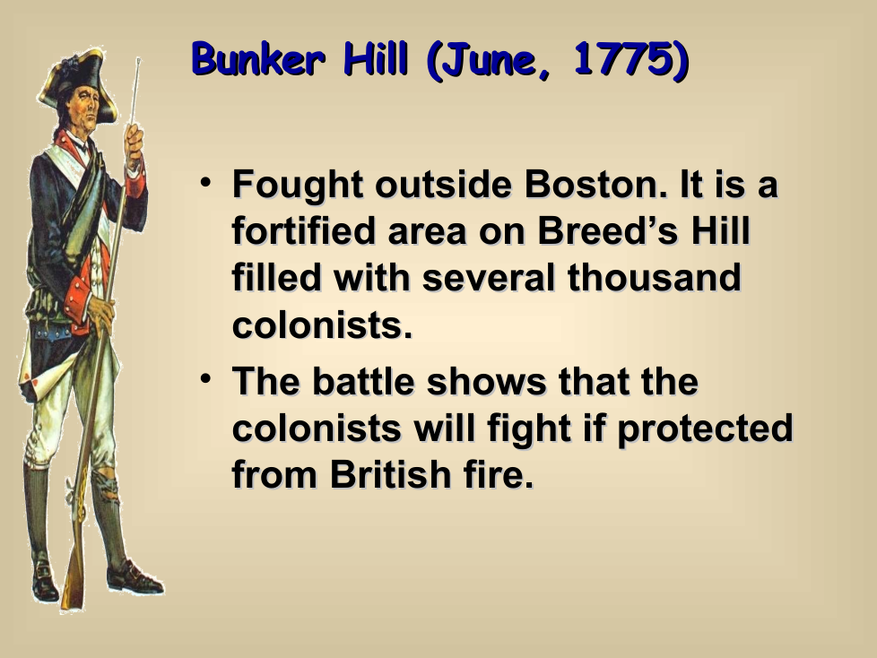 After the Boston Tea Party (1773), Parliament passed the Coercive Acts (1774), punishing Massachusetts by closing Boston Harbor and stripping away the right to self-government. As a result, the Continental Congress met in 1774 to consider a unified colonial response. The Congress issued a declaration of rights stating, “That they are entitled to life, liberty, & property, and they have never ceded [given] to any sovereign power whatever, a right to dispose of either without their consent.” Military clashes with British forces at Lexington, Concord, and Bunker Hill in Massachusetts showed that American colonists were willing to resort to force to vindicate their claim to their rights and liberties.