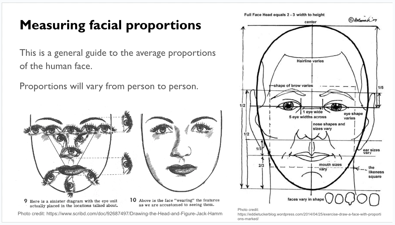 Review measuring and drawing facial proportions as shown in the image. Using these as a guide you will first complete a CONTOUR LINE drawing of yourself, your facial features and your hair (you may work from a photo). Upload a photo of your completed contour line drawing here.