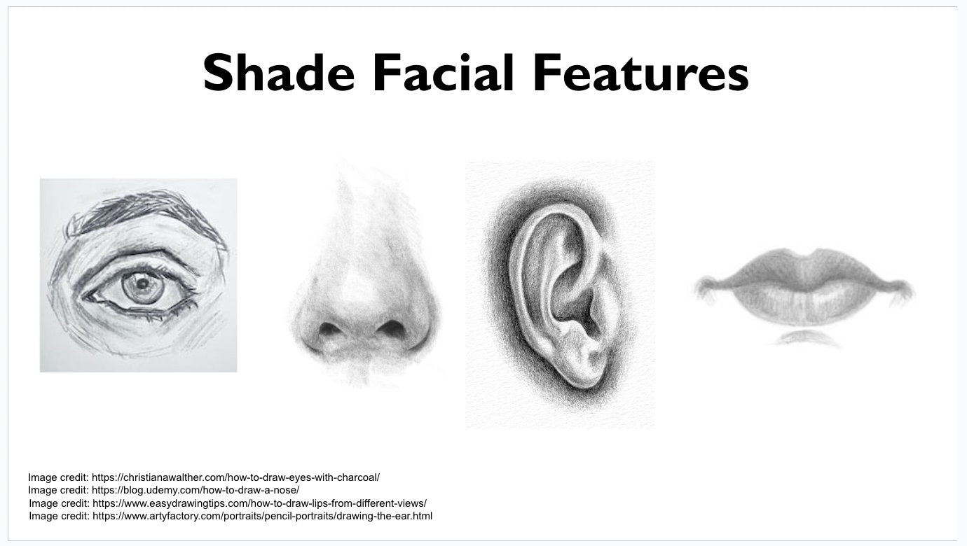Once you have completed your contour line drawing of yourself, start to shade each facial feature following the tutorials completed in prior lessons. Add your hair then upload your completed portrait here following the guidelines in the rubric.