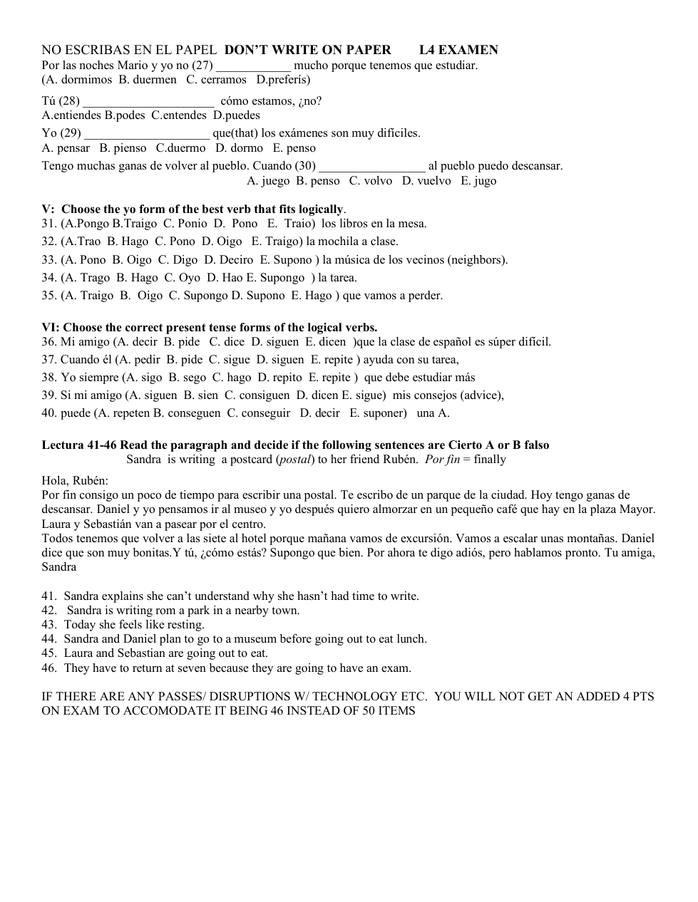 Lectura 41-46: Read the paragraph and decide if the following sentences are Cierto A or B falsoSandra is writing a postcard (postal) to her friend Rubén. Por fin = finallyHola, Rubén: