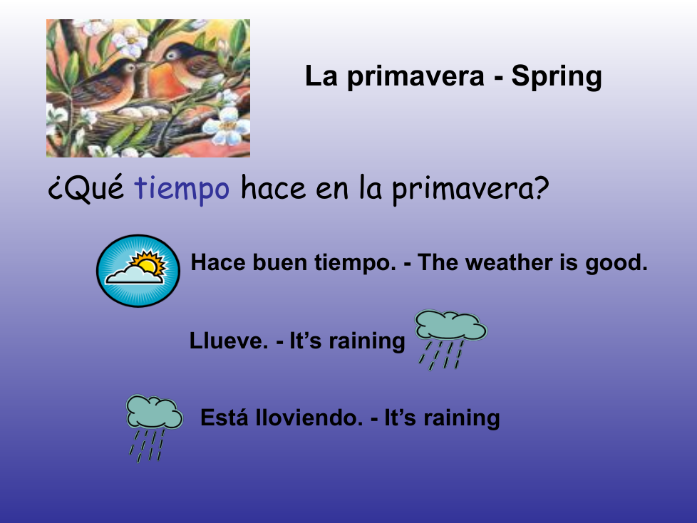 Hace buen tiempo. | arrow_right_alt | It's raining. |