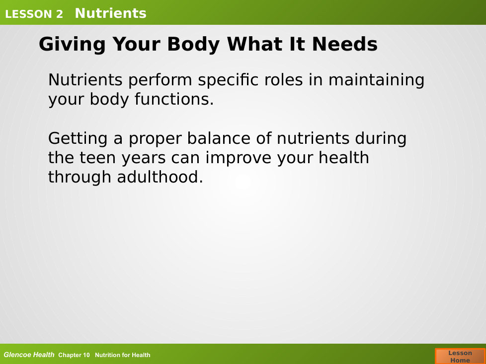 A proper balance of nutrients during the teen years can _______ your health through _______