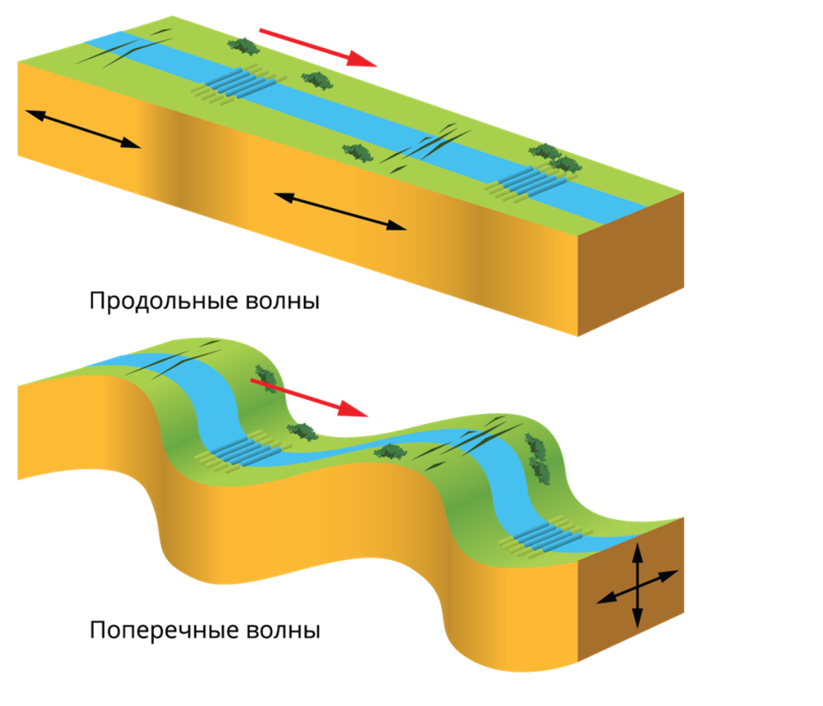 Продольная волна достигает поверхности Земли первой. Поперечная волна отстаёт от продольной, но сила её удара больше, чем у продольной волны. Именно поэтому при землетрясении за первым толчком следует второй, более разрушительный.