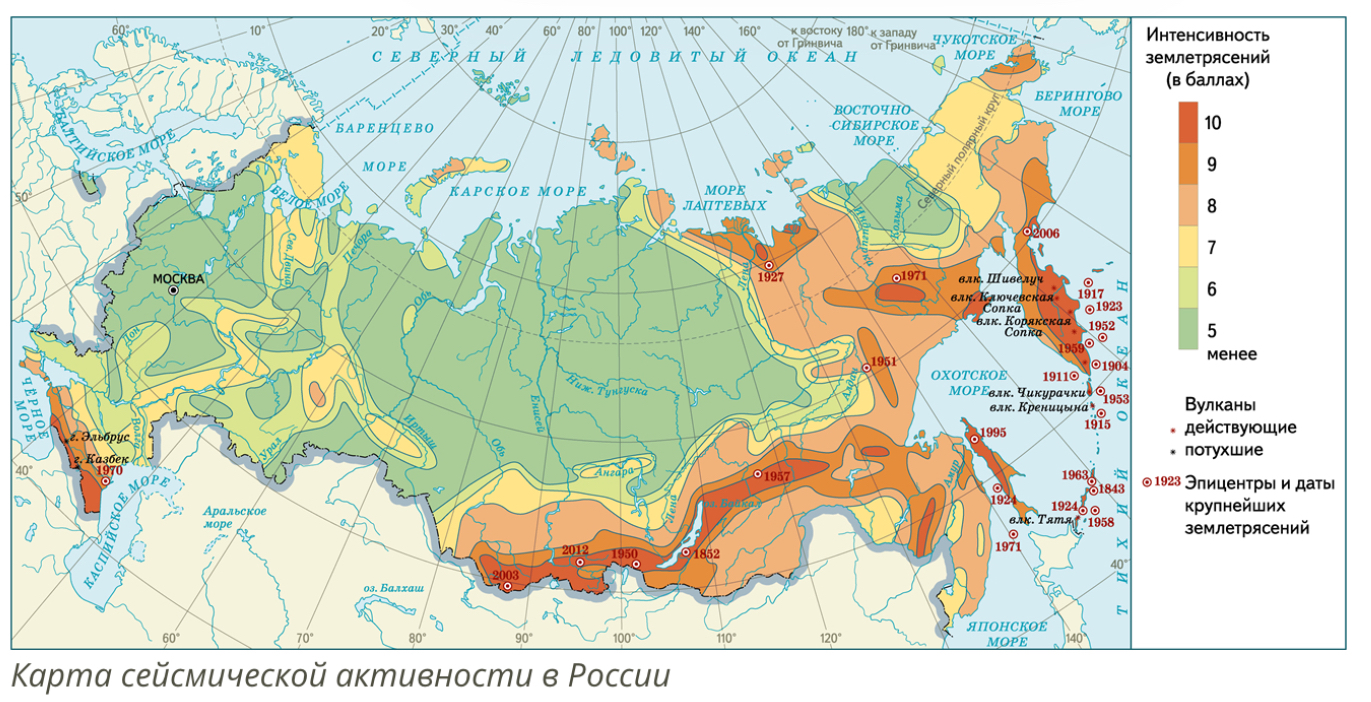Домашнее задание: Закрась зоны на территории Российской Федерации, где чаще всего происходят землетрясения