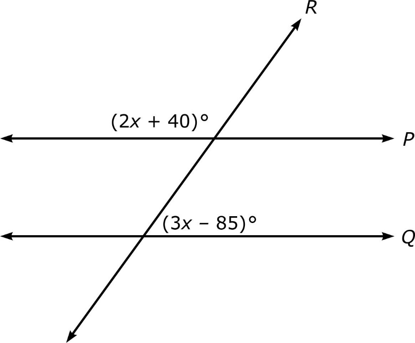 In the diagram, parallel lines P and Q are cut by transversal R.