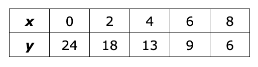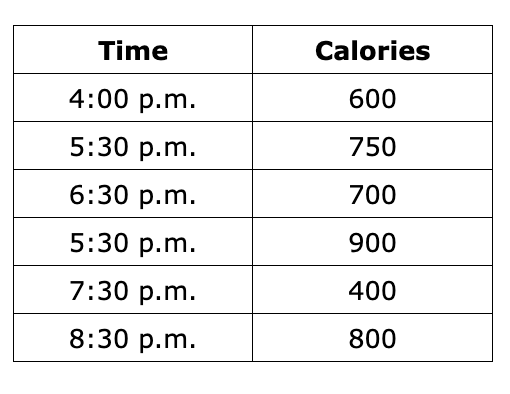 Susan recorded the time she ate dinner and the number of calories she consumed during dinner for six consecutive days. The results are shown in the table.