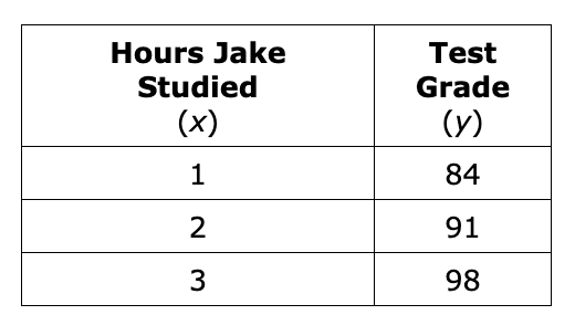 The table shows the number of hours Jake studied for his math tests and his corresponding grade.