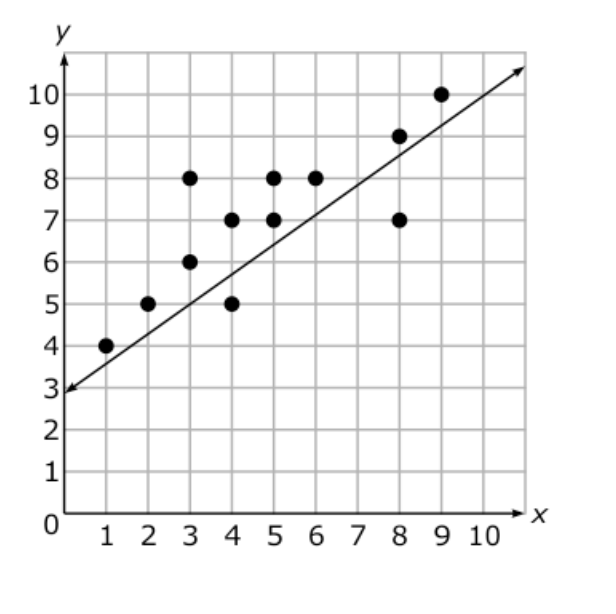 The scatterplot shows the data points, and it also shows the linear model that Henry drew. Which statement best describes the linear model?