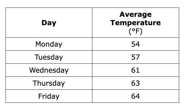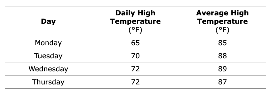 Kennedy measured the daily high temperature outside her home for four days. She compared these measurements to the average high temperature for her region using the table below.