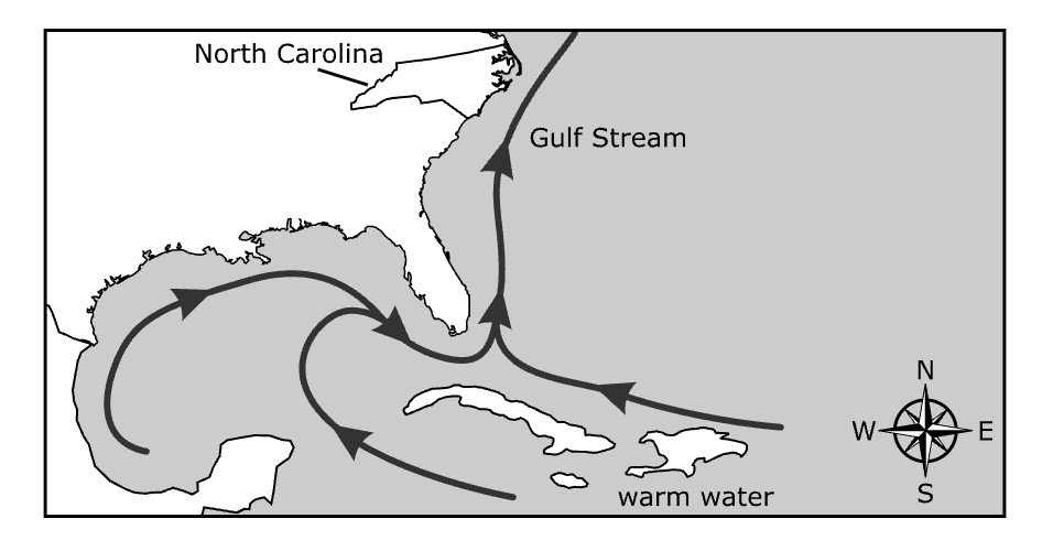 The map below shows the path of the Gulf Stream as it flows past the coastline of North Carolina.