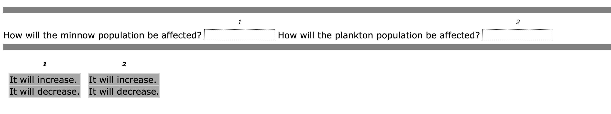 The tuna population decreases because of overfishing. Select (click and drag) the effect of the decrease in the tuna population on the other populations in the food chain. Fill in all of the cells. Options may be used more than once.