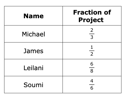 A group of friends were each completing a project of the same size. This table shows how much of the project each friend has completed.